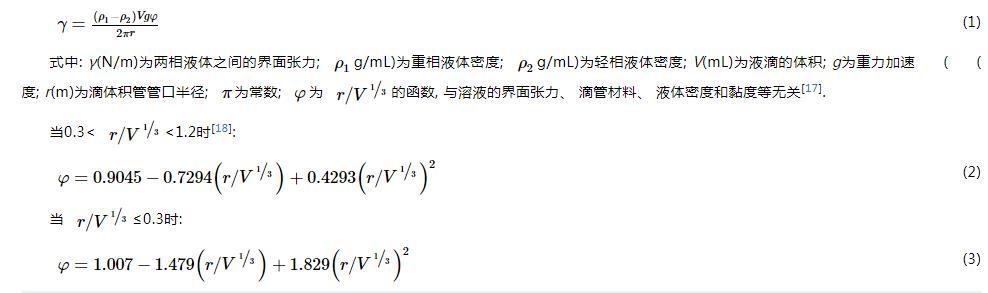 式中:γ(N/m)為兩相液體之間的界面張力;ρ1(g/mL)為重相液體密度;ρ2(g/mL)為輕相液體密度;V(mL)為液滴的體積;g為重力加速度;r(m)為滴體積管管口半徑;π為常數(shù);φ為r/V1/3的函數(shù),與溶液的界面張力、滴管材料、液體密度和黏度等無關(guān)。
