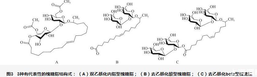 圖3 3種有代表性的槐糖脂結構式:(A)雙乙酰化內脂型槐糖脂;(B)去乙酰化酸型槐糖脂;(C)去乙酰化bola型槐糖脂