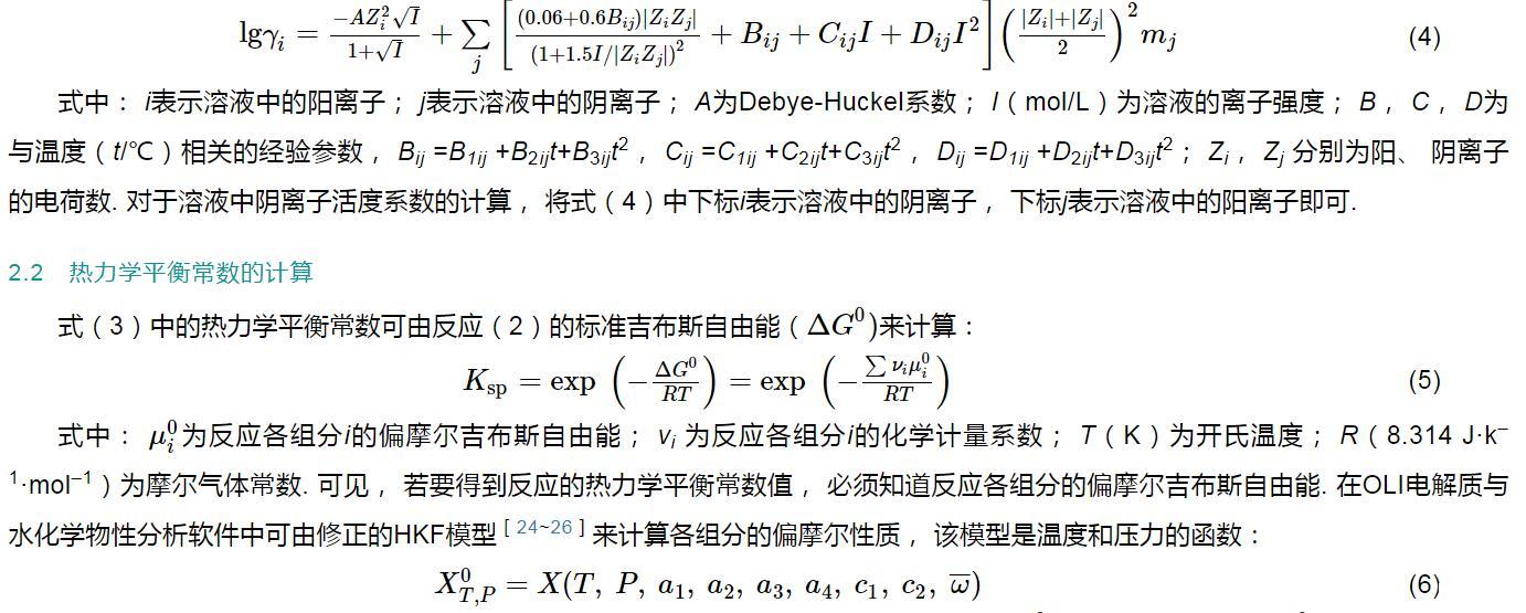 因此,式(3)中離子的活度系數(shù)可由OLI電解質(zhì)與水化學(xué)物性分析軟件[20]內(nèi)嵌的Bromley-Zemaitis方程[22,23]來計(jì)算: