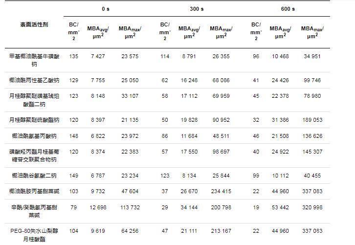表面活性劑的泡沫形態(tài)數(shù)據(jù)如表3所示,包括10種表面活性劑溶液在產(chǎn)生最大泡沫體積之后的0,300和600 s時(shí)的泡沫密度(BC)、平均氣泡面積(MBAavg)和最大氣泡面積(MBAmax);同時(shí),選取了5種具有代表性的表面活性劑,對其泡沫形態(tài)進(jìn)行拍照觀察,如圖3所示。最初,所有陰離子表面活性劑的氣泡都非常小且均勻,其中椰油酰谷氨酸二鈉、椰油酰氨基丙酸鈉和甲基椰油酰基牛磺酸鈉這3種氨基酸表面活性劑的平均氣泡面積分別為6 787,6 822和7 427μm2;而兩性和非離子表面活性劑的平均氣泡面積較大,其中椰油酰胺丙基甜菜堿為9 732μm2、辛酰/癸酰氨丙基甜菜堿為12 698μm2、PEG-80失水山梨醇月桂酸酯為9 619μm2。在600 s時(shí),大多數(shù)陰離子表面活性劑氣泡的平均面積在30 000μm2以內(nèi),椰油酰兩性基乙酸鈉的平均氣泡面積為24 426μm2,其余兩性和非離子表面活性劑的平均氣泡面積均大于40 000μm2,其中辛酰/癸酰氨丙基甜菜堿達(dá)到53 442μm2。以上結(jié)果表明,甲基椰油酰基牛磺酸鈉、椰油酰谷氨酸二鈉具有較好的泡沫形態(tài)穩(wěn)定性,600 s后其泡沫密度和氣泡面積變化相對較小,而椰油酰胺丙基甜菜堿、辛酰/癸酰氨丙基甜菜堿、PEG-80失水山梨醇月桂酸酯的泡沫密度和氣泡面積變化相對較大,其泡沫形態(tài)穩(wěn)定性較差。