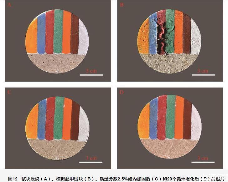 圖12試塊原貌(A)、模擬起甲試塊(B)、質(zhì)量分?jǐn)?shù)2.5%硅丙加固后(C)和20個循環(huán)老化后(D)的照片