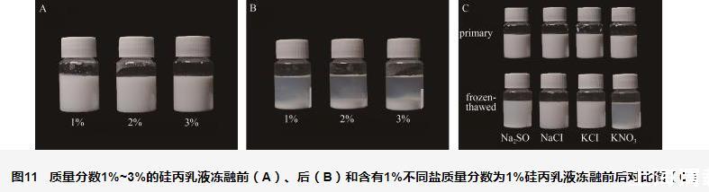 圖11質(zhì)量分?jǐn)?shù)1%~3%的硅丙乳液凍融前(A)、后(B)和含有1%不同鹽質(zhì)量分?jǐn)?shù)為1%硅丙乳液凍融前后對比圖(C)