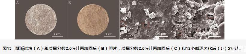 酥堿試塊(圖13A)經(jīng)硅丙乳液修復(fù)后再進行濕熱老化12個循環(huán),肉眼觀察發(fā)現(xiàn)加固后的試塊(圖13B)表面無酥堿等病害。此外,對加固后以及12次循環(huán)老化后的試塊進行SEM分析。從圖13C可以看出,修復(fù)加固后試塊內(nèi)部能看到明顯的成膜現(xiàn)象,說明硅丙乳液滲透加固性較好;而老化12個循環(huán)后(圖13D),成膜現(xiàn)象仍然存在,進一步證明硅丙乳液具有較強的收縮性和耐老化性。因而可以將其作為性能優(yōu)異的膠結(jié)材料用于酥堿壁畫的修復(fù)中。