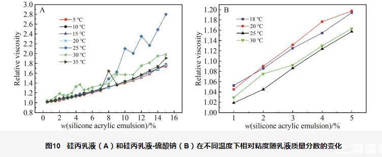 圖10硅丙乳液(A)和硅丙乳液-硫酸鈉(B)在不同溫度下相對粘度隨乳液質(zhì)量分?jǐn)?shù)的變化