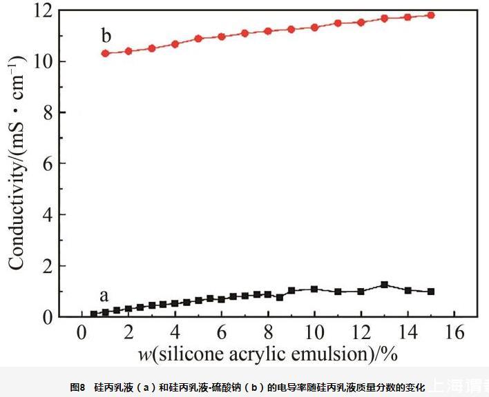 圖8硅丙乳液(a)和硅丙乳液-硫酸鈉(b)的電導(dǎo)率隨硅丙乳液質(zhì)量分?jǐn)?shù)的變化