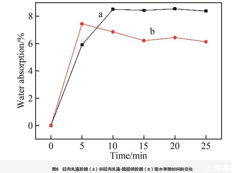圖6研究了硅丙乳液膠膜和硅丙乳液-硫酸鈉膠膜的吸水率,可以看出,隨時間增加,硅丙乳液的吸水率也逐漸增大,造成這種現(xiàn)象的原因是硅丙乳液分子結(jié)構(gòu)中的―OH和―COOH遇到水分子時形成氫鍵,在范德華力和氫鍵作用下,膠膜表現(xiàn)出一定的吸水性。另外,從圖6還可看出,硫酸鈉膠膜的吸水率較小,這是因為膠膜網(wǎng)絡(luò)結(jié)構(gòu)中的硫酸鈉在水中完全電離,膠膜三維網(wǎng)絡(luò)結(jié)構(gòu)中的Na+對膠膜中的―COO-產(chǎn)生電荷屏蔽效應(yīng),使膠膜三維網(wǎng)絡(luò)結(jié)構(gòu)內(nèi)外溶液的滲透壓差降低。同時,外部溶液中的Na+與網(wǎng)絡(luò)結(jié)構(gòu)中的―COO-發(fā)生“離子交聯(lián)”,導(dǎo)致膠膜網(wǎng)絡(luò)結(jié)構(gòu)中有效交聯(lián)密度增大,吸水率下降。