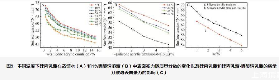 圖9不同溫度下硅丙乳液在蒸餾水(A)和1%硫酸鈉溶液(B)中表面張力隨質(zhì)量分?jǐn)?shù)的變化以及硅丙乳液和硅丙乳液-硫酸鈉乳液的質(zhì)量分?jǐn)?shù)對表面張力的影響(C)