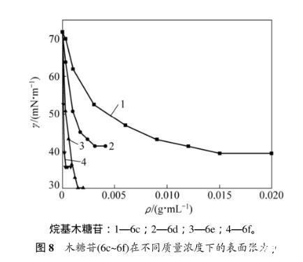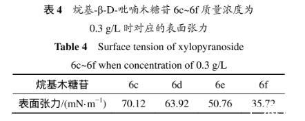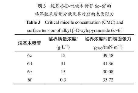表3所示為烷基-β-D-吡喃木糖苷6c~6f的臨界質(zhì)量分數(shù)及所對應的表面張力。溶液表面的吸附量達到飽和時(剛好飽和時的濃度即為臨界濃度),表面張力最小。從表3可以看出:辛基-β-D-吡喃木糖苷(6e)達到臨界濃度時對應的表面張力是最低的,能力最強。因為烷基木糖苷的表面活性是由其親水糖基和疏水烷基鏈共同決定,當烷基鏈長為=8(糖苷6e)時,親水性和疏水性達到最佳平衡,表面張力最低。