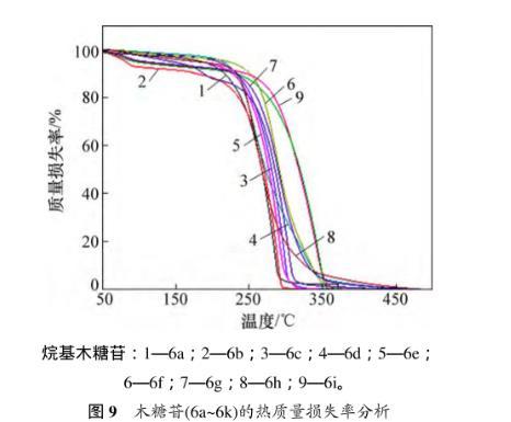 圖9所示為熱質(zhì)量損失結(jié)果。從圖9可見:烷基吡喃木糖苷6a~6i均只有1個(gè)質(zhì)量損失臺(tái)階,起始分解溫度分別為157.9,177.3,172.6,162.3,164.1,169.5,151.7,170.4和208.9℃左右,最大分解速率時(shí)的溫度依次為283.2,287.8,296.6,257.9,290.4,286.1,301.9,262.7和339.8℃。糖苷6a~6i熱分解完時(shí)的溫度分別為303.1,298.1,329.6,365.5,320.4,340.2,332.0,374.6和356.2℃。總質(zhì)量損失率為94.9%,89.9%,91.0%,91.9%,95.3%,96.6%,89.6%,88.5%和91.5%。結(jié)果表明:合成的烷基吡喃木糖苷在150℃以下是穩(wěn)定的。