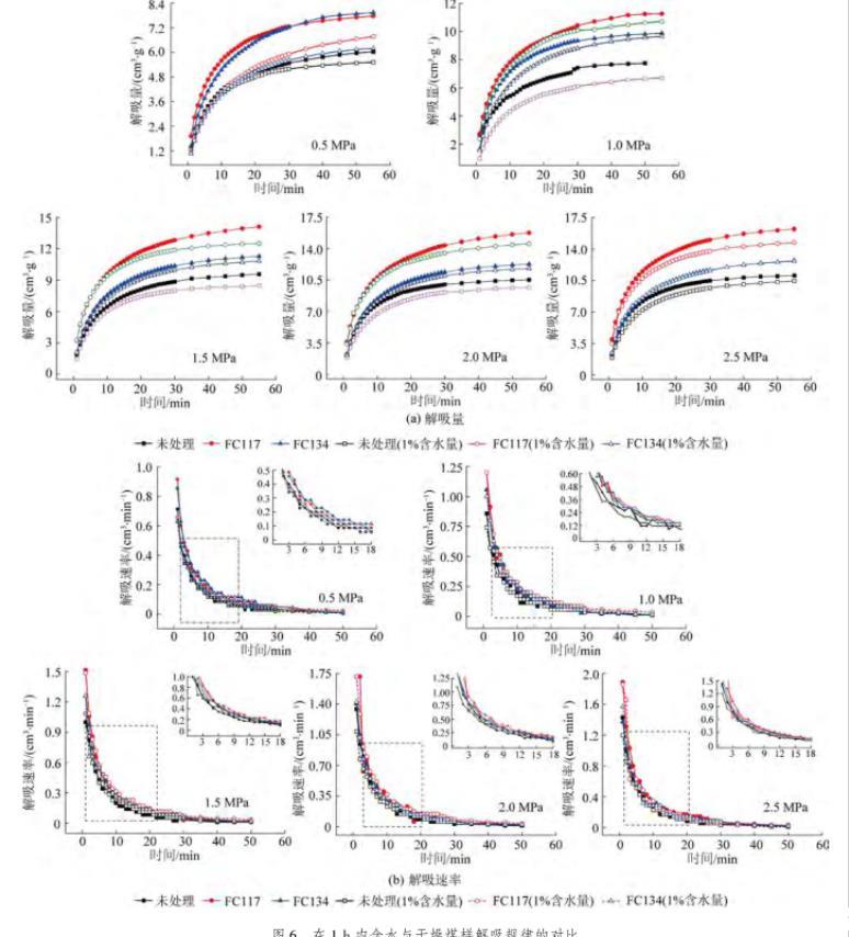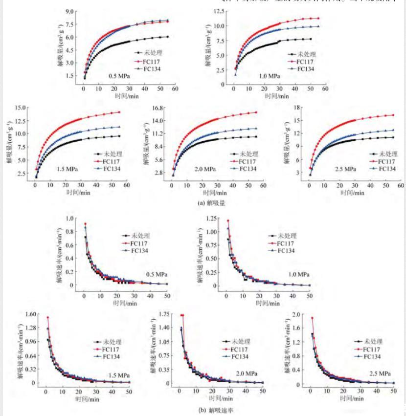 由圖6b可知,隨著甲烷吸附平衡壓力的增加,3種處理方式的含水煤樣解吸速率均有所增加。經(jīng)過(guò)氣潤(rùn)濕反轉(zhuǎn)劑FC117和FC134處理后的煤樣解吸速率也始終大于未處理的煤樣。其中,表面活性劑FC117處理后的煤樣解吸速率始終保持著顯著的效果。同時(shí),由于水鎖效應(yīng)產(chǎn)生的影響,不同處理方式的含水煤樣解吸速率均小于干燥煤樣的解吸速率。