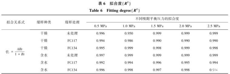 由表6可知,利用王佑安式擬合不同平衡壓力條件下的解吸量與時(shí)間關(guān)系曲線,得到曲線的擬合度。其中,氣潤(rùn)濕反轉(zhuǎn)劑處理前后含水煤樣的擬合效果最好,擬合度均大于0.99。在干燥煤樣中,F(xiàn)C134處理后的煤樣擬合度最好,不同吸附平衡壓力條件下的擬合度均大于0.99;其次是未處理和FC117,擬合度也比較好,除去未處理煤樣中吸附平衡壓力為1.0 MPa,其余均在0.98以上。