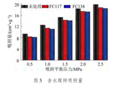 由圖5可知,隨著甲烷吸附平衡壓力的增加,氣潤(rùn)濕反轉(zhuǎn)劑處理前后煤樣的吸附量均逐漸增加,且增加量均呈現(xiàn)逐漸減小趨勢(shì)。經(jīng)過(guò)氣潤(rùn)濕反轉(zhuǎn)劑FC117和FC134處理后的煤樣吸附量始終小于未處理的煤樣,其變化規(guī)律與干燥煤樣的吸附量一致。其中,含水煤樣的吸附量略小于干燥煤樣的吸附量,其主要原因是在含水率為1%的煤樣中,少量的水滯留在煤體內(nèi)部。一方面,由于水的體積侵占了原本甲烷分子存在的空間;另一方面,由于煤樣自身的親水性,水在煤體表面的吸附能力強(qiáng)于甲烷氣體,使得部分吸附狀態(tài)的甲烷分子被置換和驅(qū)替。因此,含水煤樣的甲烷吸附量略小于干燥煤樣的吸附量。