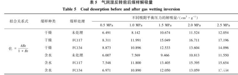 通過(guò)對(duì)干燥與含水煤樣解吸量和解吸速率的分析,經(jīng)過(guò)氣潤(rùn)濕反轉(zhuǎn)劑——FC117和FC134處理后的煤樣解吸量和解吸速率均有所提升,其中FC117的效果更加顯著。同時(shí),經(jīng)過(guò)表面活性劑處理后,煤樣的潤(rùn)濕性發(fā)生轉(zhuǎn)變,水鎖效應(yīng)得到緩解和消除。含水煤樣的解吸量和解吸速率也均大于未處理的干燥煤樣。定量地分析了表面活性劑改變煤體表面潤(rùn)濕性,由親水性向疏水性轉(zhuǎn)變,緩解水鎖損害,進(jìn)而增加煤樣解吸量。