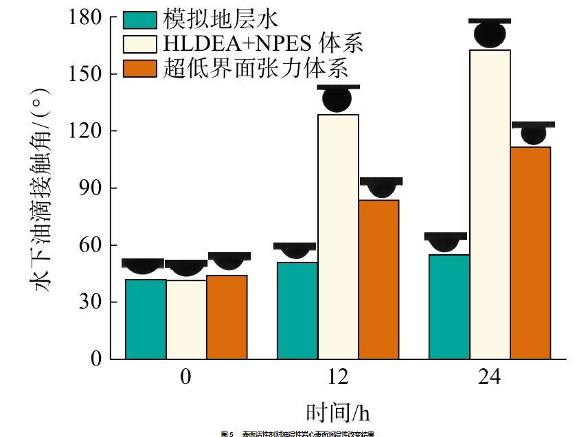通過評價表面活性劑體系在親油巖心表面的潤濕性來考查體系潤濕調控能力,實驗結果如圖5所示。從圖5可知,地層水可較微弱地改變親油巖心表面潤濕性,但表面仍為親油表面。超低界面張力體系作用下,可在24 h內將表面水下油滴接觸角由43.98°改性到111.35°。調控界面潤濕性效果最為顯著的是HLDEA+NPES體系,24 h內水下油滴接觸角由41.34°增至162.53°,實現強親水改性。
