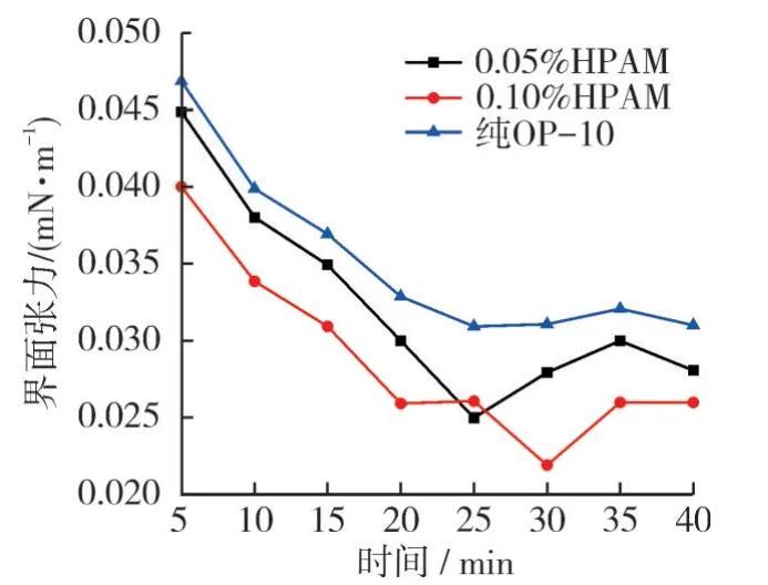 3)與純OP-10相比,0.05%和0.10%質量分數的HPAM與OP-10的復配體系的界面張力最小值和穩(wěn)定值都有所下降,且隨著HPAM質量分數的增加,界面張力降低更為明顯,進一步證明了HPAM與OP-10之間確實發(fā)生了相互作用,存在一定的協(xié)同效應。