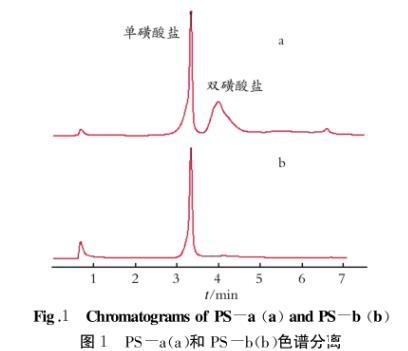從色譜圖及色譜數(shù)據(jù)分析結(jié)果得知:PS-a和PS-b均含有單磺酸鹽和雙磺酸鹽,但兩者所含單、雙磺酸鹽的量差別較大;如果以峰面積為評價標準,樣品PS-b中幾乎不含雙磺酸鹽部分,而樣品PS-a中單、雙磺酸鹽所含比例相當,約為1∶1。