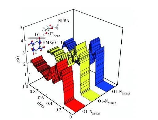 由圖3可知,O1-NNPBA1、O1-NNPBA2和O1-NNPBA3原子對(duì)分別在0.33nm和0.46nm附近出現(xiàn)峰,峰值分別為2.33、2.42、4.17和2.53、1.70、2.35,表明HMX(0 1 1)晶面上—NO2基團(tuán)中O原子與3種NPBA分子鏈上—CN基團(tuán)中N原子間存在近程和遠(yuǎn)程范德華力,其中O1-NNPBA3原子對(duì)間的近程范德華力作用最強(qiáng),O1-NNPBA1原子對(duì)間的遠(yuǎn)程范德華力作用最強(qiáng)。可見對(duì)于NPBA分子而言,增加—CN基團(tuán)的數(shù)量可增強(qiáng)其與HMX晶體間的近程范德華力作用;同時(shí),減少乃至用—COOCH3基團(tuán)替代—COOCH2CH2OH基團(tuán)可弱化分子鏈側(cè)基的空間位阻作用,有利于增強(qiáng)—CN基團(tuán)與HMX晶體間的遠(yuǎn)程范德華力作用。
