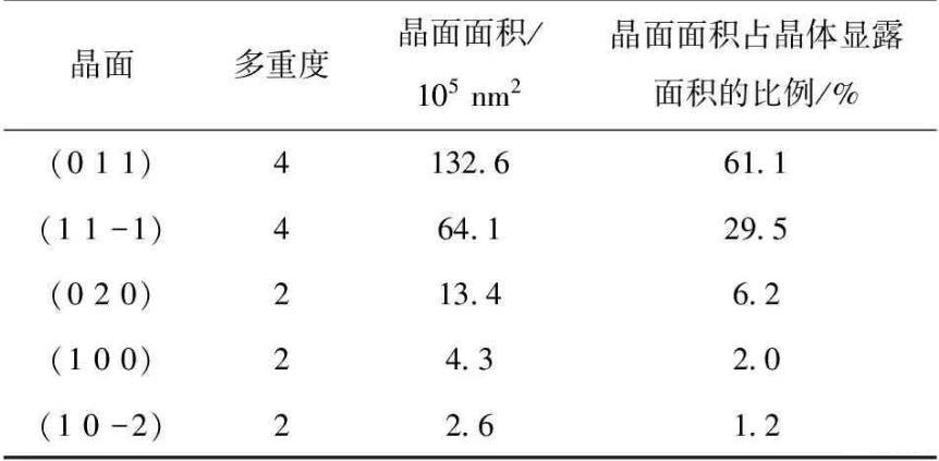 由于HMX以晶體形式存在,因此建立HMX吸附NPBA界面模型前,需先確定與NPBA分子產(chǎn)生作用的具體晶面。為此,選用與實(shí)驗(yàn)結(jié)果吻合較好的Growth Morpholog方法,計(jì)算得到了HMX的晶體形貌,為棱柱狀晶體(見圖2),其主要晶面及參數(shù)見表1.