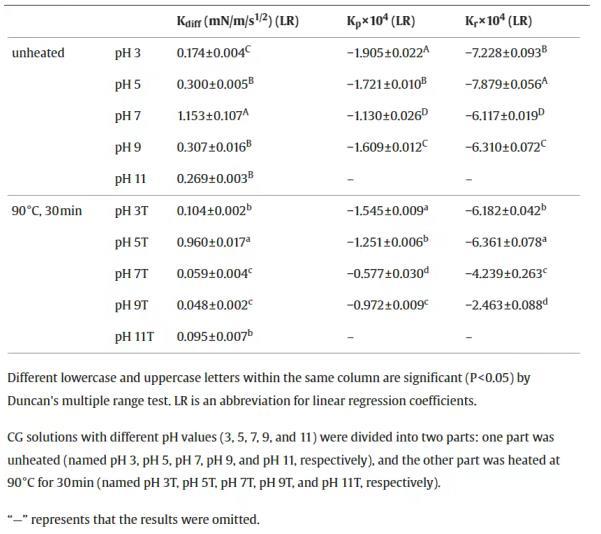 Kdiff、Kp和Kr的最高值分別為pH值7、3和5。柔性蛋白可以在油水界面上更快地吸附和重新排列。pH為3時CG靈活的二級結構,使其具有更好的吸附動力學,。pH 5(接近pI 4.3)的CG更弱的靜電斥力,引起了更好的結構重排。加熱后,除pH值為5時CG的Kdiff外,所有樣品的Kdiff、Kp和Kr均有所下降。加熱后的CG具有較低的初始界面張力和較短的平衡吸附時間(圖1a),它能迅速達到平衡狀態,并且吸附動力學指數較低。此外,加熱后的CG表現出顯著的變性和聚集,殘留的蛋白質分子會產生空間位阻,從而阻礙聚集后的CG到達油水界面。此外,不溶性CG聚集體對殘留CG分子的吸附產生了屏障。CG在pH為5時,蛋白質形成大量沉淀,溶解度僅為12.05%。可溶性蛋白含量低意味著較弱的靜電排斥力,這使剩余的蛋白更容易擴散,從而導致最高的Kdiff。與動態界面張力相比,CG與pH 5T的吸附動力學不受蛋白質濃度的影響。