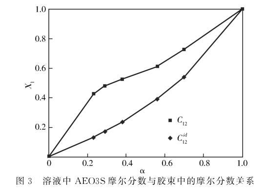 圖3溶液中AEO3S摩爾分數與膠束中的摩爾分數關系