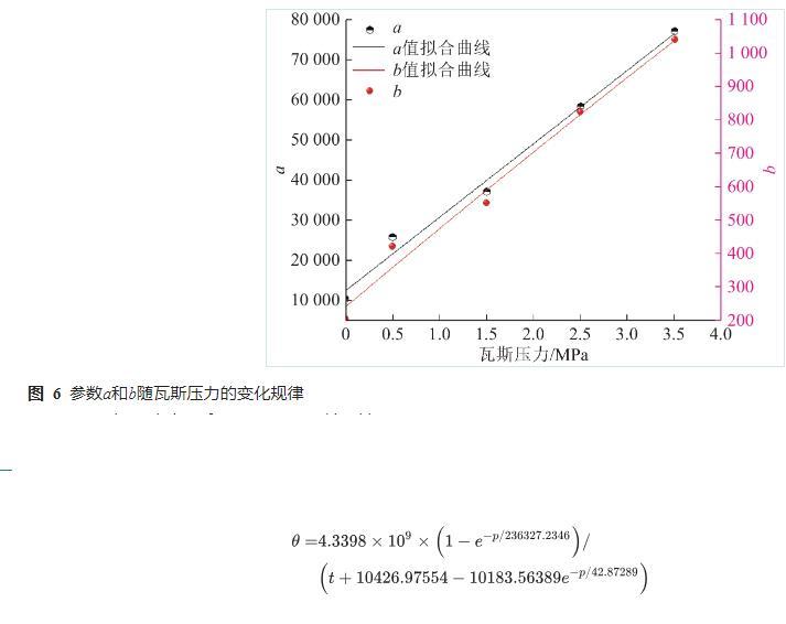 由圖5可知,同一瓦斯壓力下,接觸角隨著時(shí)間的增加而逐漸減小,說明水分在含瓦斯煤表面發(fā)生了浸潤(rùn)現(xiàn)象。接觸角θ與時(shí)間t滿足的關(guān)系,參數(shù)a和b的值如圖6所示。參數(shù)a與壓力p滿足的關(guān)系,參數(shù)b與壓力p滿足的關(guān)系。接觸角與壓力及時(shí)間的關(guān)系如式(4)所示。