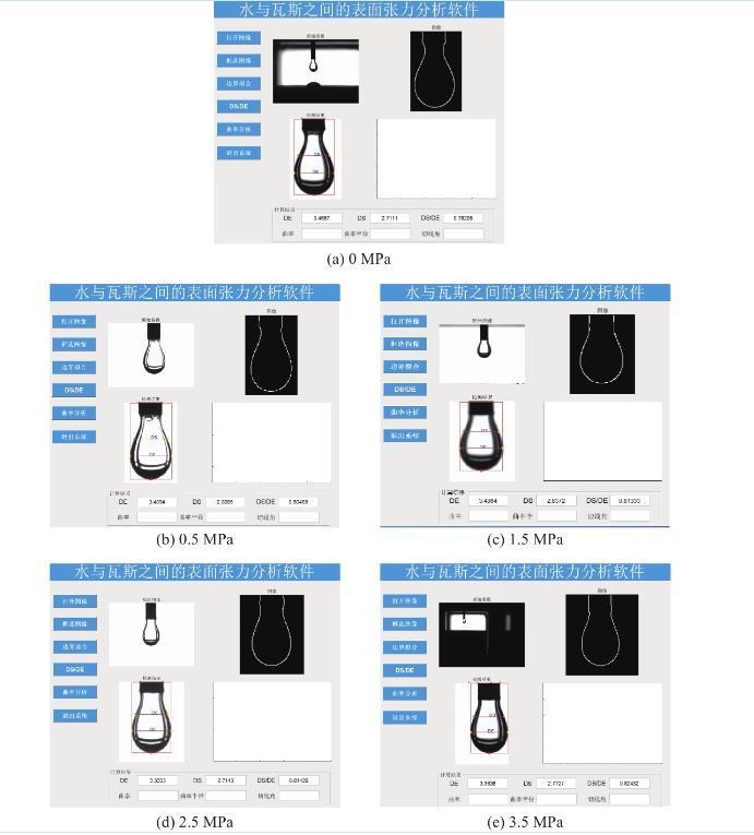 采用團(tuán)隊(duì)自開發(fā)的水與瓦斯之間的表面張力分析軟件對(duì)不同瓦斯壓力條件下的水滴形貌(圖3)進(jìn)行分析,即可獲得式(1)中的Ds及De。F為G修正后的形狀因子,F(xiàn)通過查表及插值法獲得,式(1)中的參數(shù)見表1,將表1中的參數(shù)帶入式(1)及式(2),即可獲得不同瓦斯壓力條件下水與瓦斯之間的表面張力(圖4)。