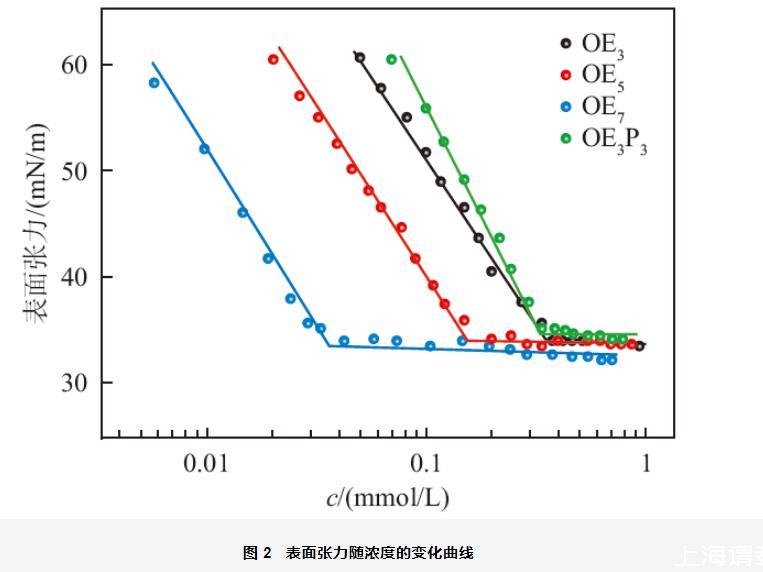 OEn水溶液的表面張力隨濃度的變化曲線如圖2所示。從圖中可以看出,隨著OEn濃度的增加,其表面張力都逐漸降低,當濃度達到cmc時,表面張力不再變化,說明其在體相內已經形成了聚集體。由表面張力曲線得到OEn的表面活性參數如表1所示。OE3、OE5、OE7的γcmc分別為34.17,33.91和33.79 mN/m,由于這三種表面活性劑的分子僅相差2個EO基團,整體結構相差不大,因此它們的γcmc相差不大。OE3、OE5、OE7的cmc分別為0.32,0.19和0.036 mmol/L,其cmc值隨著分子中EO基團數目的增多而減小,Jin等將EO基團對表面活性劑溶液的這種影響歸因于EO基團在分子中起疏水基的作用。Ivanova等人報道了C10E3的cmc為0.46 mmol/L,稍高于本文中OE3的cmc值,這是因為OE3具有較長的烷基鏈,其疏水性高于C10E3所致。通過上述分析發現,EO加合數對OEn的cmc影響要明顯高于對γcmc的影響。