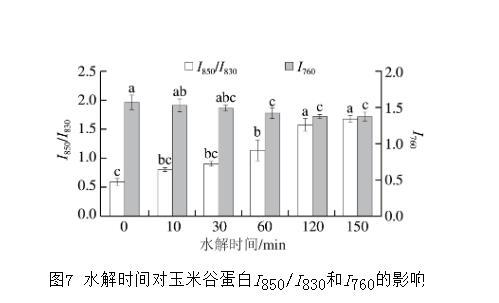圖7水解時(shí)間對(duì)玉米谷蛋白I850/I830和I760的影響