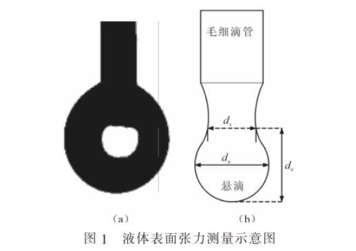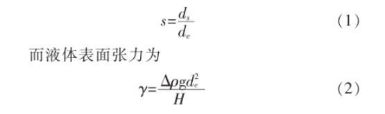 筆者采用液體表面張力的測量方法為懸滴法,即通過測量懸掛著的液滴的外形參數(shù)而推算出液體表面張力,如圖1所示。在憎水角測試儀配套的微量進(jìn)樣器中滴出液滴,拍攝液滴照片,讀取液滴形態(tài)參數(shù)的像素值,根據(jù)測量滴管的實際尺寸和像素值,獲得像素值和實際尺寸的比例,換算實際液滴的尺寸參數(shù),并根據(jù)公式推算表面張力。