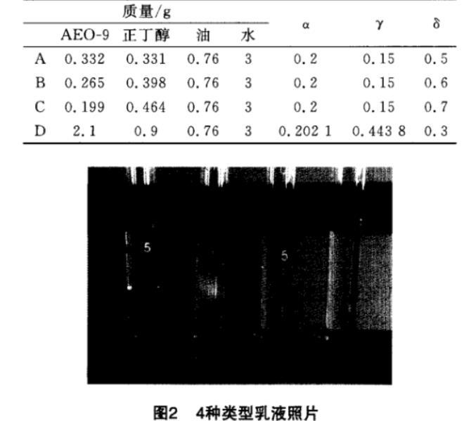 由圖1可見,在所配制的乳液中,既有均相乳液,也有兩相(上相、下相)乳液,同時有三相(中相)乳液。在選擇典型體系時,應(yīng)體現(xiàn)出全面性,即以上4種類型乳液都涉及到,同時應(yīng)考慮到漸變性,即固定某個變量(此處固定γ),一種相態(tài)向另一種相態(tài)轉(zhuǎn)變。由此,選出其中4組:A(下相乳液)、B(中相乳液)、C(上相乳液)、D(均相乳液),A、B、C、D的組成如表1所示,形成的乳液照片如圖2所示。分別將乳液部分分離出來,稀釋成質(zhì)量分?jǐn)?shù)為0.1%、0.3%、0.5%、1.0%的微乳液。