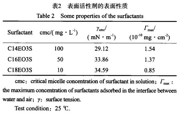 表面活性劑分子的結(jié)構(gòu)特點(diǎn)決定了其在水溶液界面(液-氣)上的吸附特性,其極性基團(tuán)指向水、非極性基團(tuán)則指向氣。應(yīng)用Gibbs公式可計(jì)算表面活性劑在單位溶液表面的最大飽和吸附量(Γmax),表面活性劑的表面性質(zhì)見(jiàn)表2。由表2可見(jiàn),C14EO3S,C16EO3S,C18EO3S表面活性劑在蒸餾水中的cmc分別為100,50,10 mg/L,對(duì)應(yīng)的γcmc分別為29.12,33.86,34.59 mN/m。由此可見(jiàn),表面活性劑在蒸餾水中的cmc隨疏水基鏈長(zhǎng)的增加而降低。這是因?yàn)椋阂环矫妫敬季垩跻蚁┟鸦撬猁}表面活性劑中含有親水的EO基團(tuán),其分子鏈呈鋸齒蜷曲形態(tài)排列,分子占據(jù)面積較大;另一方面,分子中的疏水基鏈長(zhǎng)的增加,導(dǎo)致疏水基團(tuán)的相互作用增強(qiáng),對(duì)蜷曲的分子起到拉伸作用,同時(shí)會(huì)降低分子親水頭基面積,在這兩個(gè)相反作用中疏水基的相互吸引作用隨著疏水鏈長(zhǎng)度的增加而明顯增強(qiáng),使得表面活性劑分子排列更緊密,易于形成膠束。但cmc對(duì)應(yīng)的γcmc則隨疏水基鏈長(zhǎng)的增加而略有增加。