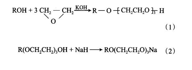 EO數(shù)為3的C14脂肪醇聚氧乙烯醚(3)磺酸鹽(C14EO3S)、C16脂肪醇聚氧乙烯醚(3)磺酸鹽(C16EO3S)、C18脂肪醇聚氧乙烯醚(3)磺酸鹽(C18EO3S)按文獻(xiàn)[1]報(bào)道的方法合成,產(chǎn)物經(jīng)兩相滴定法測(cè)定磺酸鹽含量,純度均達(dá)到95%以上。合成反應(yīng)見(jiàn)式(1)~(3)。