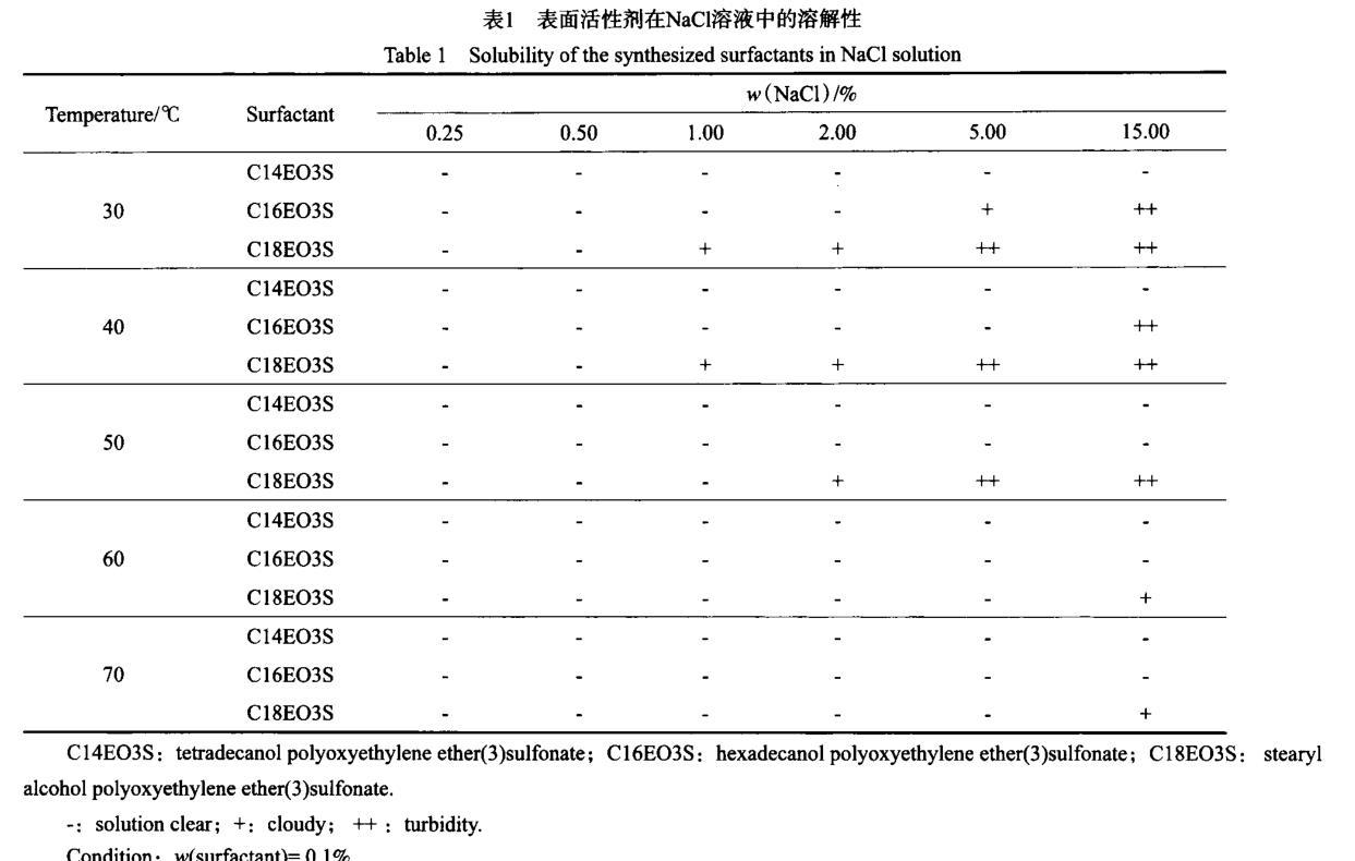表面活性劑在NaCl溶液中的溶解性見(jiàn)表1。從表1可看出,在實(shí)驗(yàn)溫度(30~70℃)內(nèi),C14EO3S在不同NaCl含量的溶液中均具有較好的溶解性;C16EO3S在30℃的5.00%(w)NaCl溶液中出現(xiàn)渾濁現(xiàn)象,但隨溫度的升高,溶解性增強(qiáng);C18EO3S的溶解性較差,當(dāng)溫度為30~40℃時(shí),它在1.00%(w)的NaCl溶液中即開(kāi)始出現(xiàn)渾濁現(xiàn)象,溶解性隨溫度的升高而逐漸增大,當(dāng)溫度升至60℃后僅在15.00%(w)的NaCl溶液中出現(xiàn)渾濁現(xiàn)象。實(shí)驗(yàn)結(jié)果表明,脂肪醇聚氧乙烯醚(3)磺酸鹽表面活性劑中的脂肪醇碳原子數(shù)越少(碳原子數(shù)小于16),在鹽溶液中的溶解性越好。