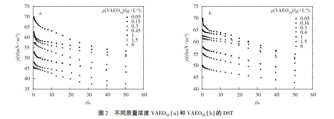 先測定不同質量濃度表面活性劑室溫25℃時的靜態表面張力,通過γ-lgρ曲線求得VAEO{}_{10}和VAEO20的臨界膠束濃度(cmc)分別為0.6和0.7g/L(0.83和0.62mmol/L),臨界表面張力(gamma_{text{cmc}})分別為32.9和39.8mN/m.動態表面張力(DST)試驗的表面活性劑質量濃度選擇在10-1——102cmc之間。不同質量濃度VAEO{}_{10}和VAEO{}_{20}在25℃下的DST測定結果如圖2所示。