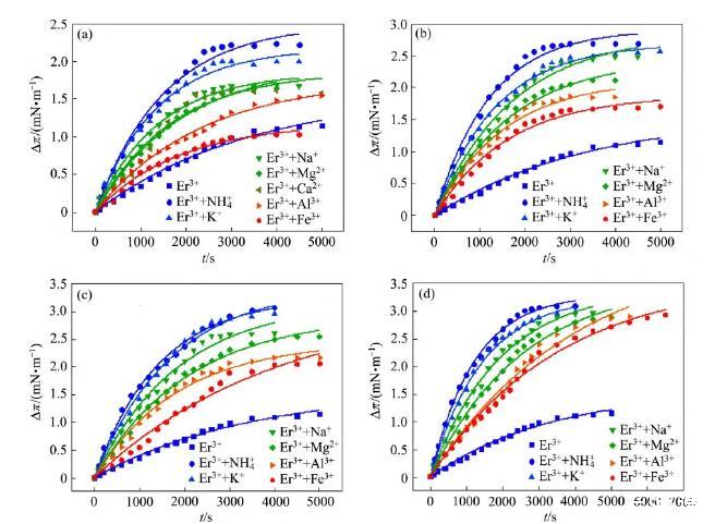 圖1為鉺離子與不同鹽陽離子的二元混合水溶液表面P507單分子膜的Δπ?t曲線。