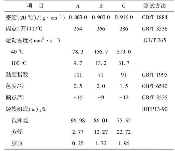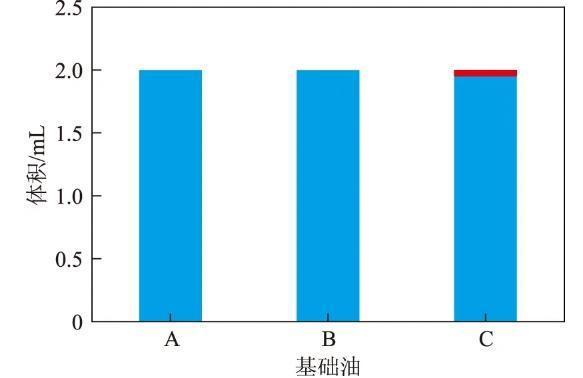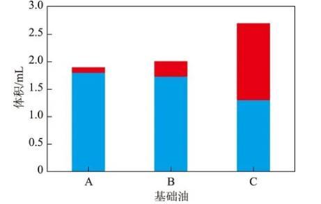 一般情況下,界面活性由小到大的順序為:飽和烴<芳烴<膠質(zhì)。重芳烴及膠質(zhì)組分中的極性物質(zhì)具有較強的界面活性,它們的存在可以降低油品與水的界面張力,使油品容易乳化。且復(fù)合劑的加入進一步降低了油水的界面張力,導(dǎo)致油品乳狀液穩(wěn)定性增強,其分水性變差。加入的復(fù)合劑可能與油品中所含芳烴和膠質(zhì)等極性化合物結(jié)合,導(dǎo)致基礎(chǔ)油分水性更差。所以基礎(chǔ)油中所含極性組分越多,其與加入的復(fù)合劑結(jié)合的程度就越強,導(dǎo)致基礎(chǔ)油的分水性越差。結(jié)合表1進行分析可知:基礎(chǔ)油A的黏度最小,且芳烴和膠質(zhì)等極性化合物含量最少,其分水性最好;基礎(chǔ)油C的黏度最大,且芳烴和膠質(zhì)等極性化合物含量最高,其分水性最差;基礎(chǔ)油B的黏度和極性組分含量比A大、比C小,其分水性能介于A與C之間。