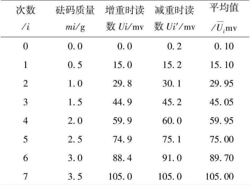 對于力敏傳感器靈敏度的測量,保持不增加實驗成本的原則,采用多次測量,先依次增加片碼個數(shù),再依次減少片碼個數(shù)的方法平均人為誤差,然后用逐差法求得力敏傳感器的靈敏度,具體測量數(shù)據(jù)如表1所示。
