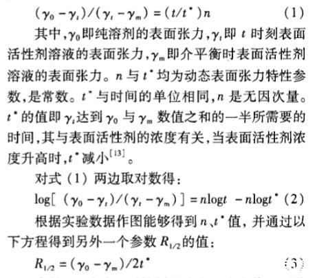 其中,即純?nèi)軇┑谋砻鎻埩Γ磘時(shí)刻表面活性劑溶液的表面張力,即介平衡時(shí)表面活性劑溶液的表面張力。n與t均為動(dòng)態(tài)表面張力特性參數(shù),是常數(shù)。t與時(shí)間的單位相同,n是無(wú)因次量。t的值即達(dá)到。與7數(shù)值之和的一半所需要的時(shí)間,其與表面活性劑的濃度有關(guān),當(dāng)表面活性劑濃度升高時(shí),t減小。