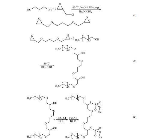 材料有:1-十二烷醇C12H25OH,化學(xué)純,濟(jì)寧宏明化學(xué)試劑有限公司生產(chǎn);四丁基硫酸氫銨(TBAHS)Bu4NHSO4,分析純,天津致遠(yuǎn)化學(xué)試劑有限公司;1,3-丙二醇HOCH2CH2CH2OH,分析純,濟(jì)寧宏明化學(xué)試劑有限公司生產(chǎn);環(huán)氧氯丙烷C3H5ClO,化學(xué)純,濟(jì)寧宏明化學(xué)試劑有限公司生產(chǎn);氫氧化鈉NaOH,分析純,濟(jì)寧宏明化學(xué)試劑有限公司生產(chǎn);無(wú)水乙醇C?H?OH,化學(xué)純,濟(jì)寧宏明化學(xué)試劑有限公司生產(chǎn);BF3-乙醚溶液,北京化工廠生產(chǎn);氯磺酸HSO3Cl,化學(xué)純,成都化夏化學(xué)試劑有限公司生產(chǎn);去離子水,分析純,實(shí)驗(yàn)室自制。