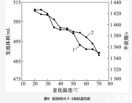 將起泡劑溶液在一定溫度下老化一定時(shí)間后,測試其發(fā)泡體積和泡沫半衰期的變化以評價(jià)其抗溫性能。稱取0.2 g起泡劑ULT-1于攪拌杯中,加入100 mL蒸餾水,置于攪拌器之上,以轉(zhuǎn)速11 000 r/min攪拌1 min。裝入老化罐,放入滾子加熱爐,在一定溫度下滾動(dòng)16 h,取出冷卻至室溫,以轉(zhuǎn)速11 000 r/min攪拌1 min,測量發(fā)泡體積和半衰期。通過改變老化溫度測量起泡性能與老化溫度的關(guān)系,結(jié)果如圖9所示。從圖9可知:0.2%的新型起泡劑溶液在一定溫度范圍內(nèi)(20~70℃),隨著老化溫度的升高起泡性能基本不變,表明研制的新型起泡劑ULT-1具有較好的抗溫性能。