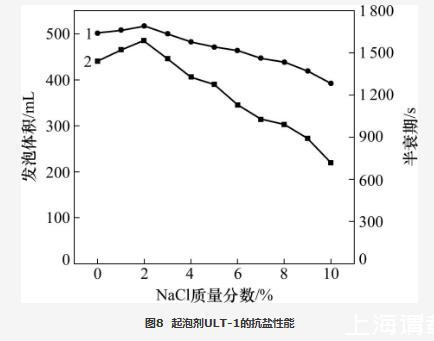 利用抗NaCl污染的能力評價(jià)質(zhì)量分?jǐn)?shù)為0.2%起泡劑ULT-1水溶液的抗鹽性能。在室溫下,稱取0.2 g起泡劑ULT-1于攪拌杯中,加入100 mL蒸餾水,置于攪拌器之上,以轉(zhuǎn)速11 000 r/min攪拌1 min。直接加入一定量的NaCl,以轉(zhuǎn)速11 000 r/min攪拌1 min,測量發(fā)泡體積和半衰期。通過改變NaCl的質(zhì)量分?jǐn)?shù)測量起泡性能,結(jié)果如圖8所示。從圖8可知:當(dāng)NaCl質(zhì)量分?jǐn)?shù)在2%以內(nèi)時(shí),發(fā)泡體積和半衰期緩慢增大,當(dāng)NaCl質(zhì)量分?jǐn)?shù)繼續(xù)增大時(shí),發(fā)泡體積和半衰期緩慢降低;當(dāng)NaCl質(zhì)量分?jǐn)?shù)達(dá)10%時(shí),發(fā)泡體積和半衰期仍能保持較高水平,表明研制的新型起泡劑ULT-1具有較好的抗鹽性能。