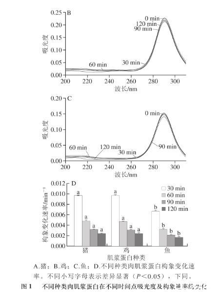 圖1不同種類肉肌漿蛋白在不同時間點吸光度及構象速率的變化