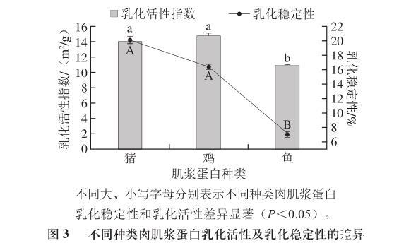 在前面的研究中得到,蛋白質的疏水性及粒徑大小等會影響其油-水界面的性質,而蛋白質作為乳化劑其界面特性在它們形成和穩定乳液能力方面起著重要作用,進而影響蛋白質的乳化活性。油-水界面屬于高能界面,未加乳化劑形成的乳化體系會很快崩潰,蛋白質是兩性物質,既有疏水基團也有親水基團,這樣才使得蛋白質具有獨特的乳化性能,且蛋白質表面疏水性越大,蛋白質所制得的乳液穩定性也會增強。對于不同肉類同種蛋白,表面特性和構象特性的差異會引起乳化活性和乳化穩定性的不同,如圖3所示。雞肉肌漿蛋白乳化活性最高,豬肉肌漿蛋白乳化活性稍低于雞肉但無顯著差異性(P>0.05),但是魚肉肌漿蛋白乳化活性顯著低于豬肉和雞肉肌漿蛋白(P<0.05),這一結論與蛋白構象穩定性結果相符合。在鹽酸胍誘導蛋白變性時,隨時間的增加使其形成剛性結構,這正是導致魚肉肌漿蛋白的峰值變化速率相比較豬肉和雞肉而言差異性顯著且其乳化活性較低的原因。雞肉肌漿蛋白的穩定性相對于豬肉肌漿蛋白有所下降但差異性不顯著,可能是因為雞肉肌漿蛋白粒徑相對最大,導致其形成乳液液滴變大,而一般來說乳液液滴越小越穩定,所以粒徑可能是導致雞肉肌漿蛋白穩定性變差的原因。而3種肌漿蛋白中魚肉肌漿蛋白的乳化穩定性顯著最差(P<0.05),這可能與魚肉肌漿蛋白的構象穩定性相對較差有關。
