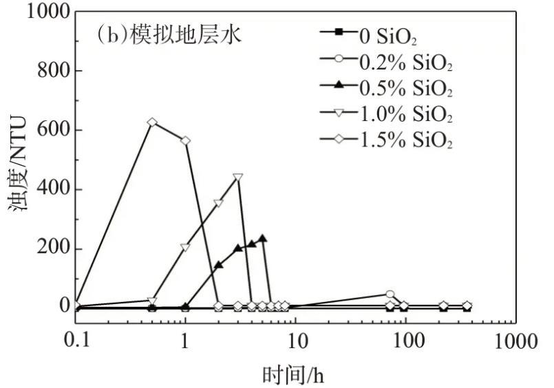 用模擬地層水配制的納米SiO2/SDS體系經歷了澄清透明-渾濁-沉降的3個階段,靜置初始,納米SiO2質量分數為0.5%的體系的濁度不隨時間的延長而變化,表明此時體系穩定;靜置1 h后,濁度明顯增加;靜置6 h后,體系的濁度又恢復到了初始值,由于實驗測試的是樣品上半部分的濁度,說明此時體系已經完全沉降。