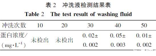 通過用生理鹽水對材料進行浸泡、多次沖洗,檢測覆層4層羥基磷灰石材料中膠原蛋白肽的泄露,來評價生物覆層材料的穩定性。對收集的浸泡液、沖洗液濃縮100倍,通過微量Lowry法檢測其蛋白濃度,在浸泡液中未檢出膠原蛋白肽,沖洗液檢測結果見表2。從表中結果可以看出隨著沖洗次數增多,泄露的膠原蛋白肽呈現先增加后減少的趨勢,說明覆層的膠原蛋白肽會有一定的脫落,但不會一直脫落,經折算,脫落膠原蛋白肽總量僅占覆層總量的0.01%,因此制備的覆層材料是穩定可靠的。
