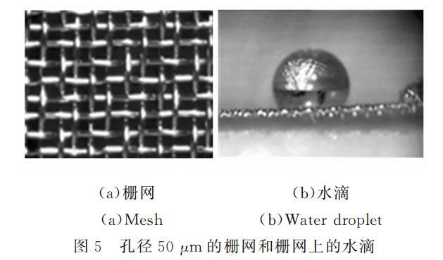 所用柵網(wǎng)為不銹鋼濾網(wǎng),有一定剛度,管道較窄,可以保證管道頂面平整。柵網(wǎng)孔為方形,使用的兩種柵網(wǎng)孔邊長分別為50mu m和77mu m。部分柵網(wǎng)涂覆Teflon(AF2400,DuPont),部分沒有做處理。圖5所示為未經(jīng)處理的柵網(wǎng)和柵網(wǎng)上的水滴。
