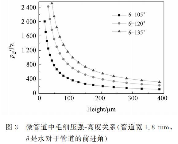 其中,l_i是液體與管道第i條邊接觸線的長度,theta_i是液體對(duì)于管道第i條邊的前進(jìn)角,對(duì)于矩形管道有i=1,2,3,4。毛細(xì)壓強(qiáng)和管道高度的關(guān)系如圖3所示。液體在疏水網(wǎng)表面的流動(dòng)阻力計(jì)算比較復(fù)雜,現(xiàn)在有很多的研究文獻(xiàn),由于這不是本文的研究重點(diǎn),文中采用了簡(jiǎn)化分析,即把柵網(wǎng)作為一個(gè)光滑的表面。計(jì)算中認(rèn)為柵網(wǎng)與管道的表面特性相同。