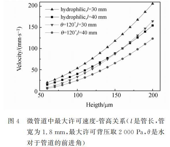 利用約束條件式(5)或(6),可以得到管道中液體的最大許可速度。為了簡(jiǎn)化分析,假設(shè)出口處壓強(qiáng)為0。計(jì)算中假設(shè)管道各個(gè)壁面性質(zhì)相同。利用式(4)計(jì)算壓降時(shí)要求流動(dòng)定常,當(dāng)液體流過干燥管道時(shí)并不是定常流動(dòng),利用式(4)作近似計(jì)算。最大許可速度與管道高度的關(guān)系如圖4所示,包括疏水管道和親水管道兩種情況。可以看出,管高一定時(shí),在親水管道中最大許可速度較大,且最大許可速度隨管高增加而增大,隨管長的增加而減小。