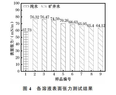 由圖4可知,純水、礦井水1#至4#、礦井水5#至8#表面張力平均值分別為57.73 mN/m、74.41 mN/m、66.03mN/m,純水表面張力明顯小于礦井水,隨著礦井水中Na+、K+數目減少,其表面張力顯著減弱。這是由于礦井水中Na+、K+離子濃度減小,靜電力吸附有效范圍擴大,吸附作用隨之增強,直至界面對離子的吸附作用逐漸大于排斥作用,因此表面張力呈現減小趨勢。由此可知,低離子濃度條件下,礦井水表面張力與其Na+、K+離子濃度呈正相關。在相同壓力條件下,表面張力決定霧滴粒徑分布,因此,純水噴霧霧化特性略優于礦井水。綜上,礦井水中Na+、K+等離子濃度通過改變其表面張力間接影響噴霧霧化特性。針對煤礦井下粉塵治理,可將降塵用水進行軟化除鹽處理后應用于噴霧降塵,以期降低其表面張力,優化噴霧霧化特性。