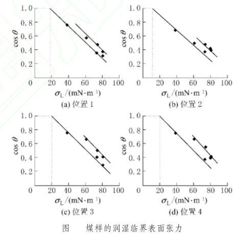 由圖2可知,煤樣不同位置處的臨界表面張力不同,按照式(3)計(jì)算得到位置1—4的臨界表面張力依次為:17.1、10.5、19.9、21.1 mN/m,分析其原因主要有2點(diǎn):一是系統(tǒng)本身所具有的人為誤差的可能;二是測(cè)點(diǎn)位置煤樣表面粗糙度不同。因此,成莊礦煤樣的總體臨界表面張力取4個(gè)不同位置臨界表面張力值的算術(shù)平均值為17.15mN/m。因此,凡是表面張力低于17.15 mN/m的水都能以零度接觸角潤(rùn)濕在成莊礦煤體表面上;表面張力大于17.15 mN/m的不同種類水,表面張力越逼近該值的,其對(duì)該煤樣的潤(rùn)濕效果越好,越有利于煤層注水。